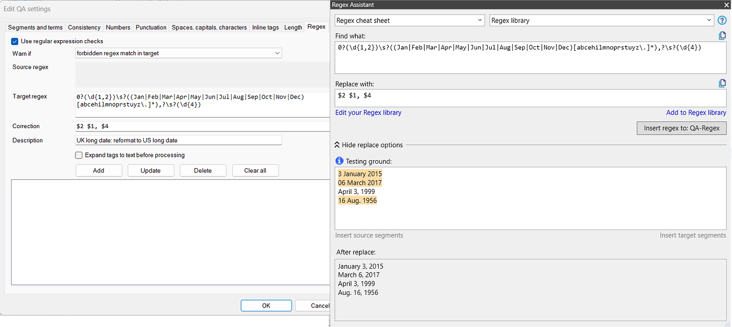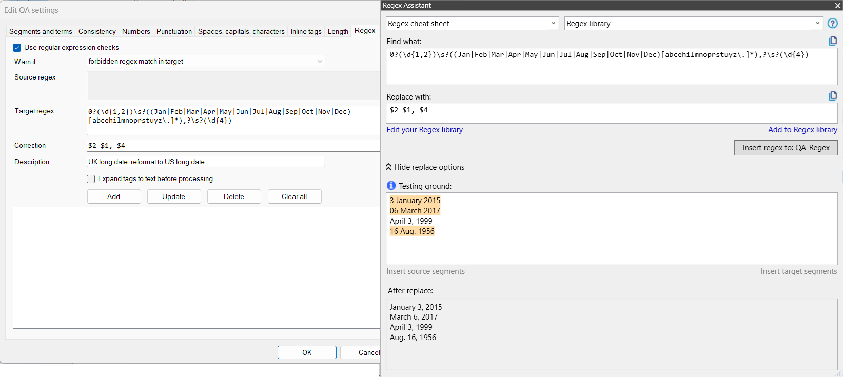 a Regex Assistant library export with US to UK and UK to US long date find & replace regexes