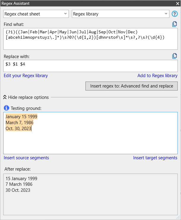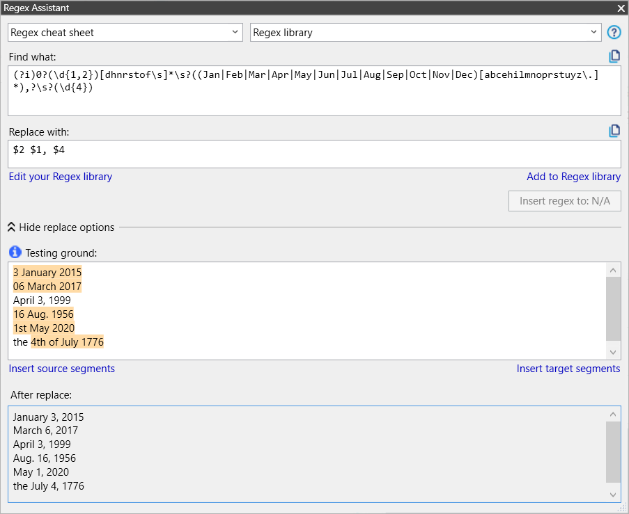 The regex used here can also be adapted to do plausibility checks on the numbers in the date. Notice that the example above strips leading zeroes for the replacement. And there is one flaw that may cause problems in some text: as written, the expression is case-sensitive. Adding