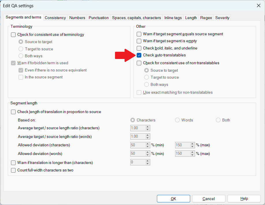 The Regex tab of the QA profile can also be used to perform specific checks on the target language and suggest corrections. Find & replace regexes saved in the Regex Assistant library are good candidates to use for this: